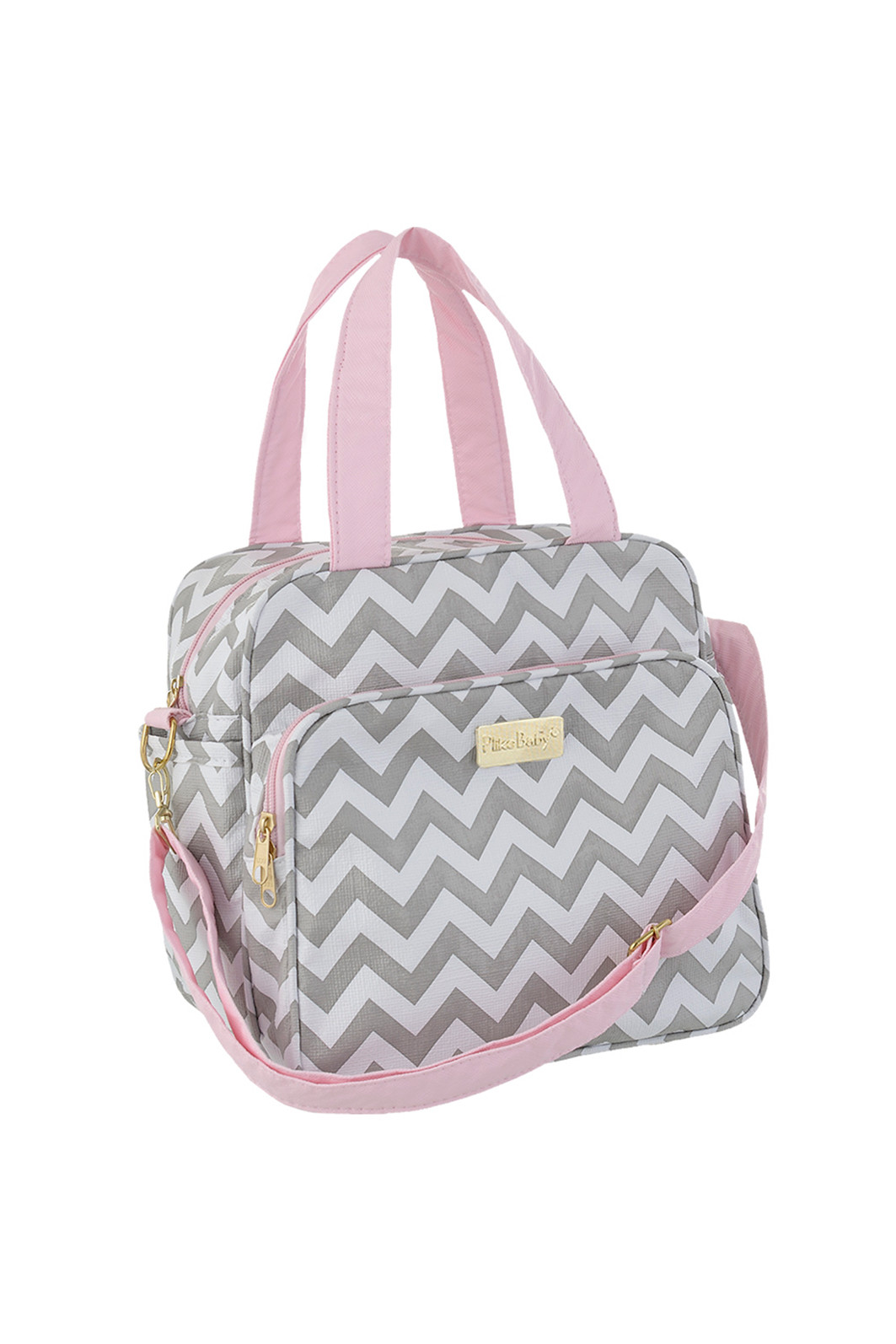 O kit de Bolsas Maternidade Plike Baby Chevron possui um design moderno na cor Cinza e com detalhes coloridos, discretos e elegantes